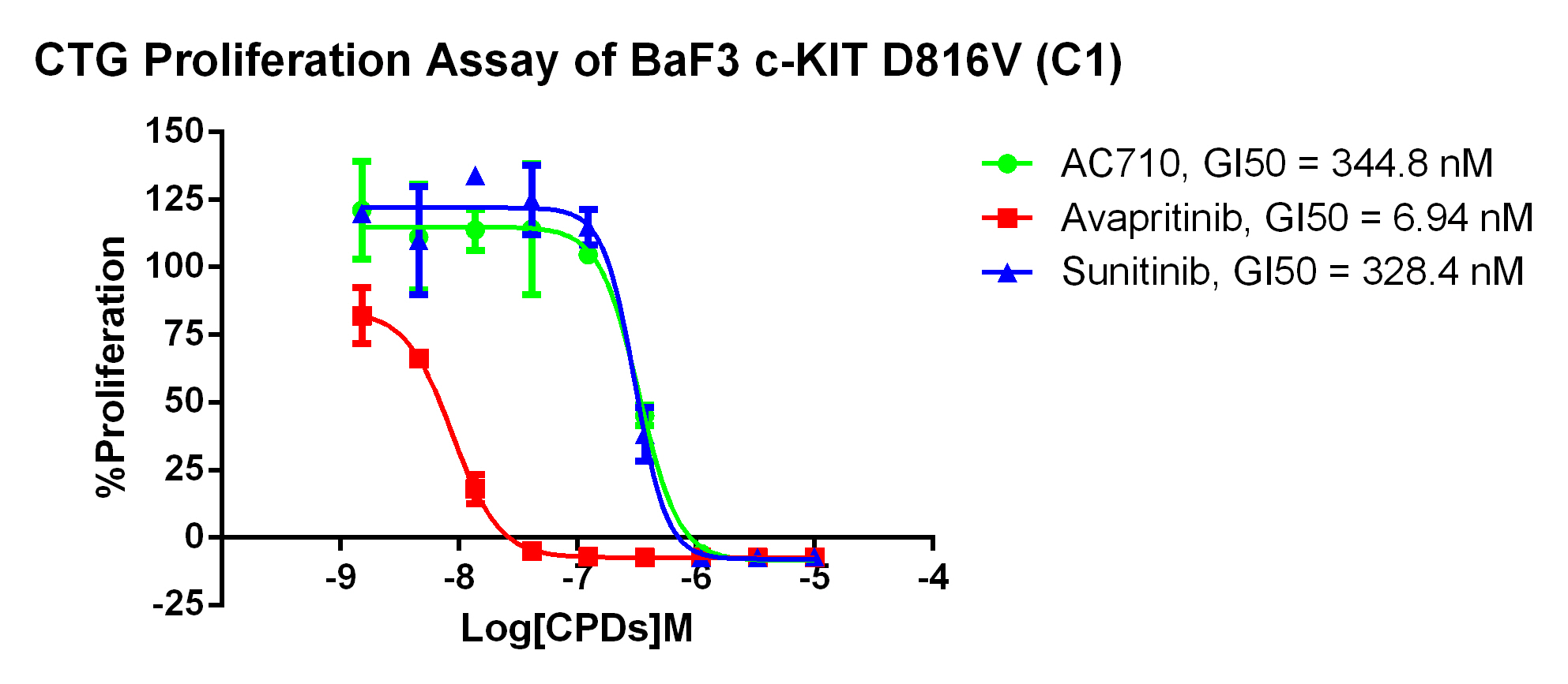 3. Anti-proliferation assay Figure 3. Anti-proliferation assay of three reference compounds on the c-Kit D816V/BaF3. |
