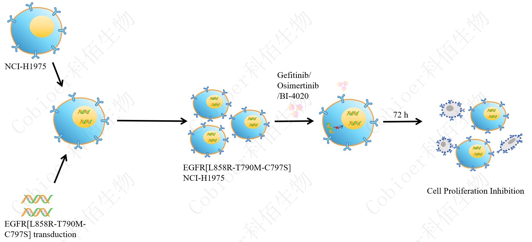 EGFR[L858R-T790M-C797S] NCI-H1975 藥靶細胞,通過(guò)轉導突變狀態(tài) 的 EGFR[L858R-T790M-C797S]基因到 NCI-H1975 細胞系中,穩定表達人突變形態(tài)下的 EGFR[L858R-T790M-C797S]基因,原理及流程見(jiàn)下圖所示。![]() Figure 1. EGFR[L858R-T790M-C797S] NCI-H1975 細胞的構建原理圖 |