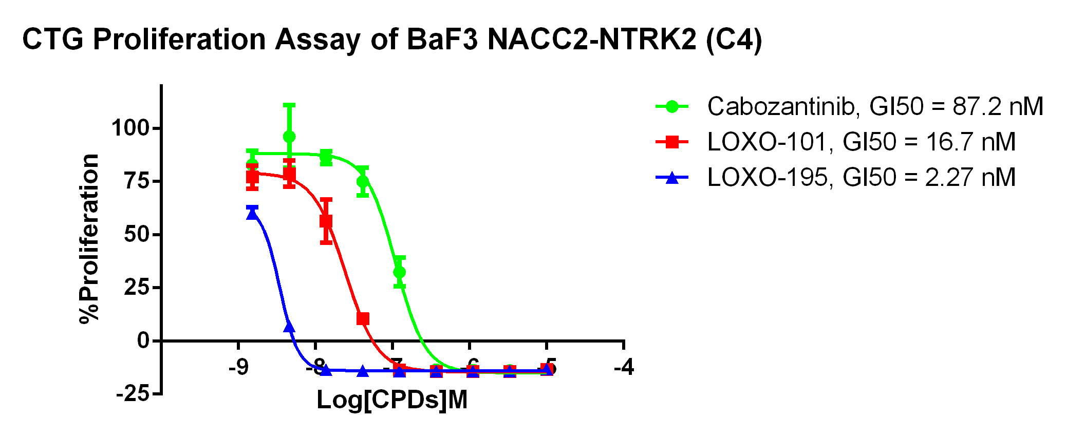 2. Anti-proliferation assay Figure . Anti-proliferation assay of three reference compounds on the NACC2-NTRK2/BaF3 Stable Cell Line. |