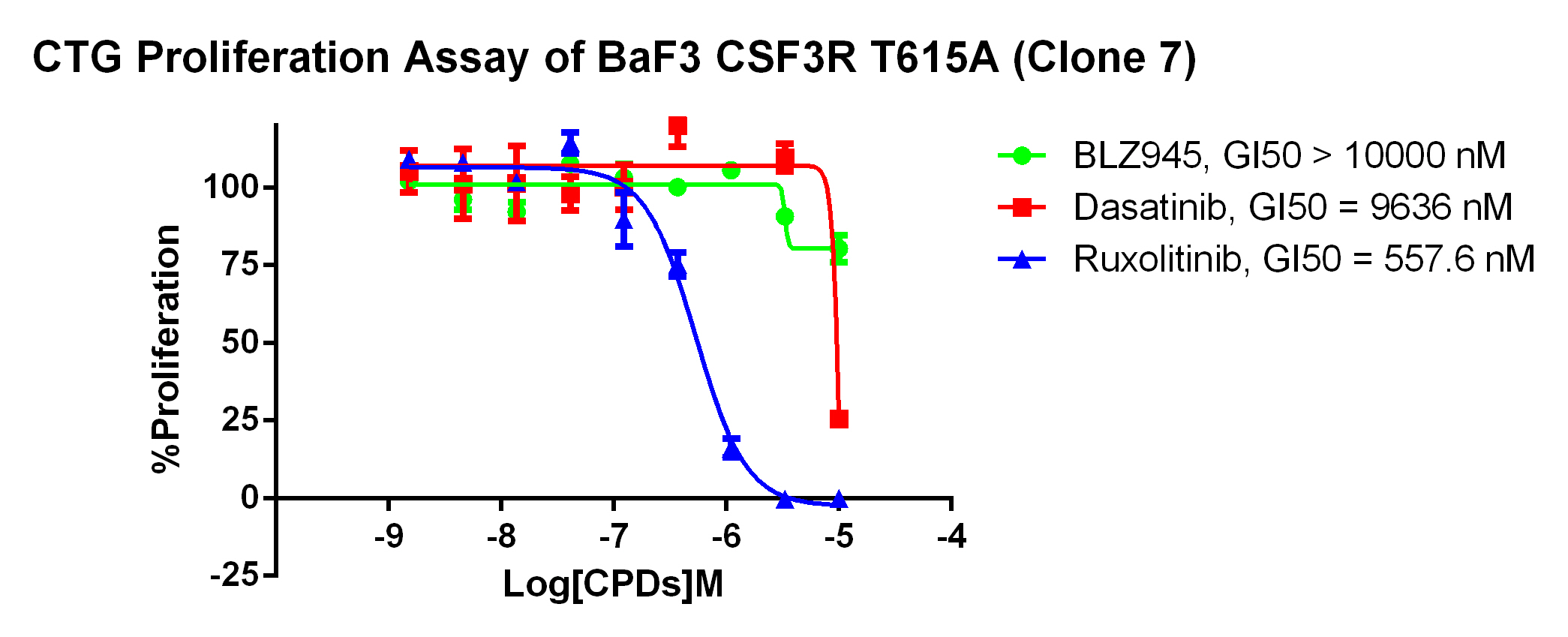 2. Anti-proliferation assay Figure 2. Anti-proliferation assay of three reference compounds on the CSF3R T615A/BaF3. |