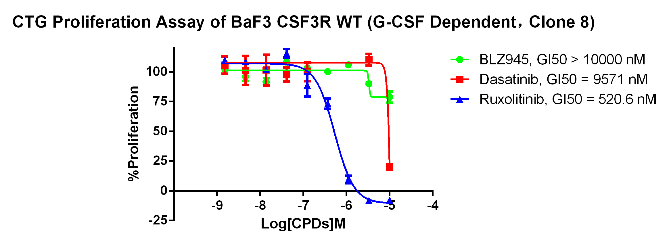 2. Anti-proliferation assay Figure 2. Anti-proliferation assay of three reference compounds on the CSF3R WT/BaF3. |