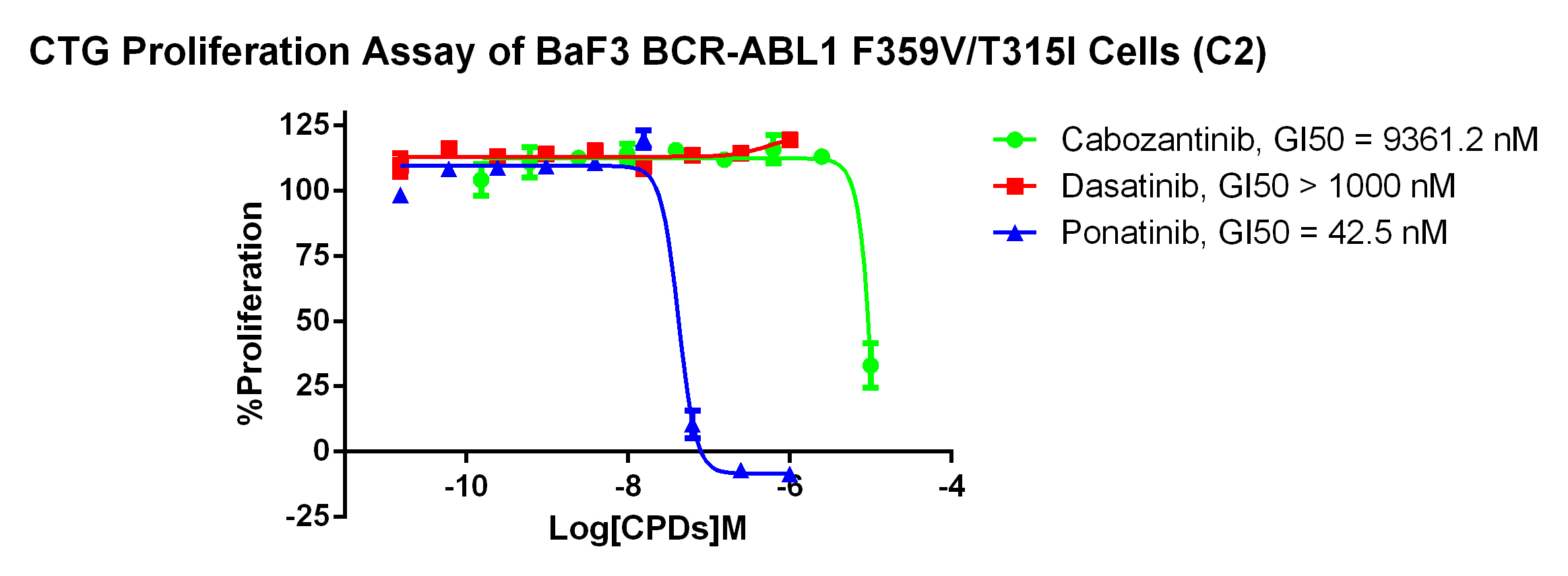 3. Anti-proliferation assay Figure 5. CTG Proliferation Assay of BaF3 BCR-ABL1 F359V/T315I Cells (C2). |