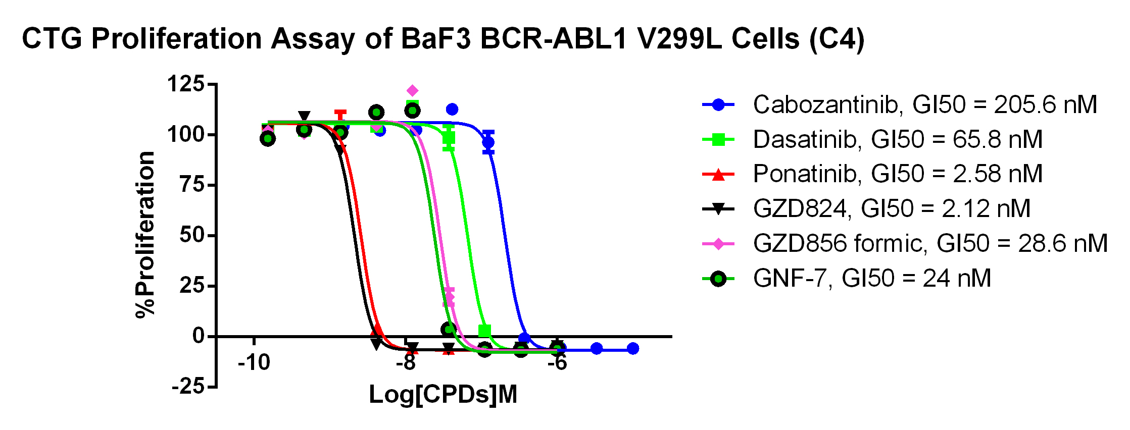 3. Anti-proliferation assay Figure 4. CTG Proliferation Assay of BaF3 BCR-ABL1 V299L Cells (C4). |