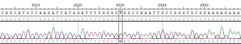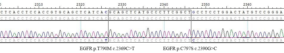 1. Sanger of EGFR L858R-T790M-C797S/BaF3 Figure 2. Sanger of EGFR p.T790M c.2369C>T、EGFR p.C797S c.2390G>C Figure 3. Sanger of EGFR L858R-T790M-C797S/BaF3 |