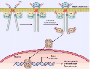 Description: | pSTAT5-Luc is designed for monitoring the induction of signal transducer and activator of transcription 5.In the activation pathway illustrated to the left, the ligand involved is a cytokine and the specific kinase taking part in activation is JAK. The dimerized STAT5 represents the active form of the protein, which is ready for translocation into the nucleus. |