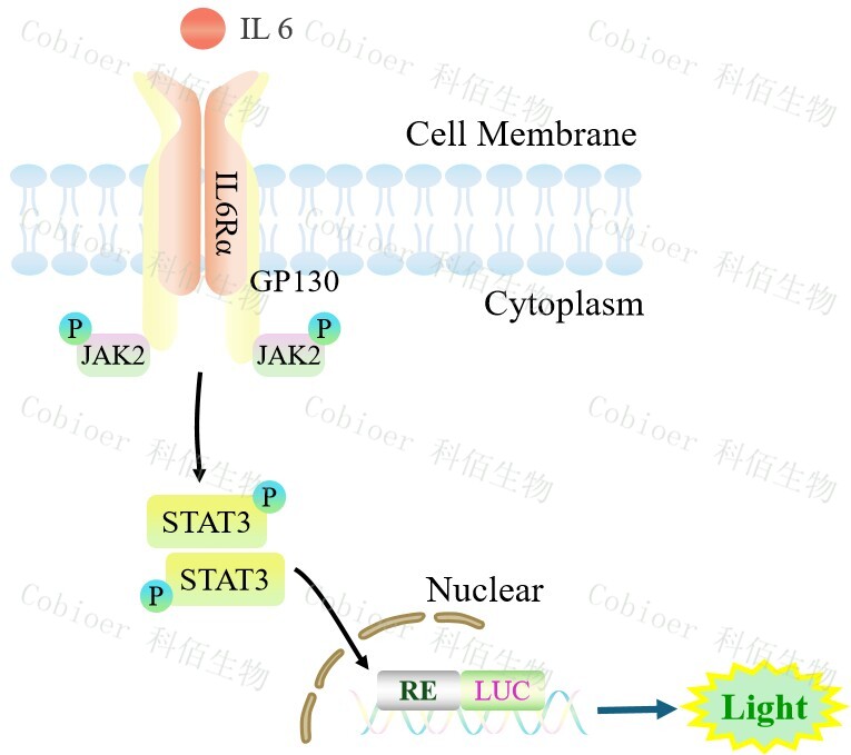 STAT3-Luc HEK293 報告基因細胞,是由 STAT3 調控并表達 Luc 熒光素 酶報告基因的 HEK293 細胞。IL6 細胞因子與受體復合物結合,啟動(dòng) JAK/STAT3 信號通路,原理見(jiàn)下圖所示。