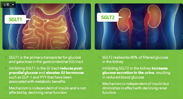 Sotagliflozin是口服的鈉-葡萄糖協(xié)同轉運蛋白1型和2型(SGLT1和SGLT2)的雙重抑制劑。SGLT1負責胃腸道中的葡萄糖吸收,對SGLT1的抑制可抑制消化道對葡萄糖和半乳糖的吸收;而SGLT2負責腎臟對葡萄糖的重吸收,對SLGT2抑制則是減少腎小管對葡萄糖的重吸收。