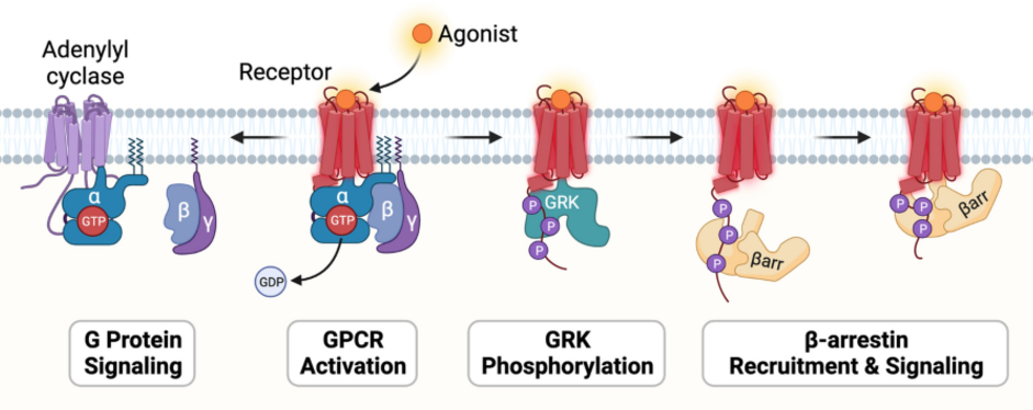 G蛋白偶聯(lián)受體(GPCR)是真核生物中最大,種類(lèi)最多的膜受體。目前,FDA 批準上市的臨床藥物中,約三分之一的藥物作用于 GPCRs發(fā)揮治療作用,GPCRs 被認為是新藥研發(fā)領(lǐng)域中最重要,也是最有應用前景的藥物靶點(diǎn)之一。GPCR 可被多種配體激活,與配體結合后,GPCR 的構象會(huì )發(fā)生變化,從而導致特定效應蛋白的募集和激活,并觸發(fā)下游信號通路的調節。GPCR的下游信號主要由G蛋白和β-arrestin介導。兩種信號之間的平衡可以受到偏向性配體的調控。偏向性配體選擇性激活某些信號,同時(shí)減少或阻止其它信號,為開(kāi)發(fā)副作用小的藥物提供了方向。