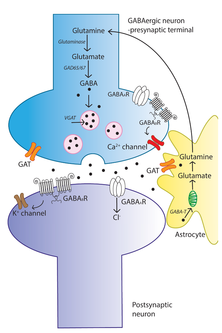 GABA的合成是通過(guò)谷氨酸酸脫羧酶(GAD)對L-谷氨酸的α-脫羧作用進(jìn)行的,并依賴(lài)于輔酶吡哆醛-5'-磷酸(維生素B6的一種維生素)。GAD存在兩種主要的亞型:65 kDa亞型(GAD65)和67 kDa亞型(GAD67)。GAD65是哺乳動(dòng)物大腦中表達的GAD的主要亞型,主要定位于突觸體的軸突末端,容易與質(zhì)膜相互作用,而GAD67則更廣泛地分布于細胞的細胞質(zhì)中。兩種GAD亞型的差異分布與細胞內兩種GABA的存在相吻合,一種存在于囊泡中,另一種存在于細胞質(zhì)中,它們通過(guò)不同的機制釋放。GABA通過(guò)囊泡GABA轉運蛋白(vGAT)的作用被募集到突觸囊泡中。在膜去極化后,GABA被釋放到突觸中,并可與突觸后膜上的嗜離子性GABA受體(GABAAR)或代謝性GABB受體(GABABR)結合,從而抑制突觸后神經(jīng)元。釋放的GABA通過(guò)膜結合的GABA轉運體(GATs)從突觸中清除,在星形膠質(zhì)細胞中,GABA被循環(huán)進(jìn)入突觸囊泡或被線(xiàn)粒體吸收,在線(xiàn)粒體中被GABA轉氨酶(GABA- t)代謝為谷氨酰胺供神經(jīng)元攝取。