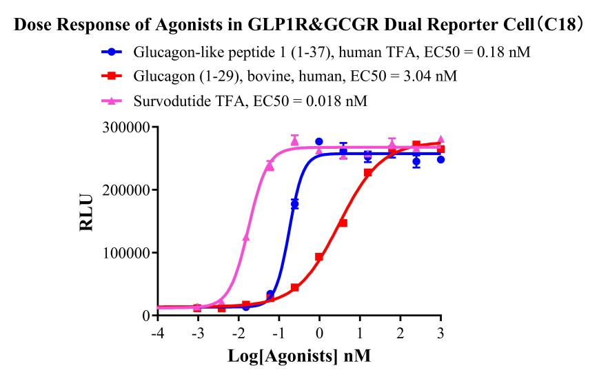 為助力雙靶點(diǎn)藥物研發(fā),南京科佰開(kāi)發(fā)了GLP1R&GCGR Dual Reporter Cell和GLP1R&GIPR Dual Reporter Cell細胞篩選模型,產(chǎn)品驗證結果如下: