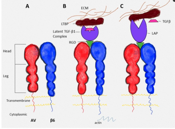 整合素αvβ6特異的配體主要配體包括細胞外基質(zhì)蛋白如纖維連接蛋白(Fibronectin)、層粘連蛋白(Laminin)以及潛活形式的TGF-β。潛伏期相關(guān)肽(LAP)是轉化生長(cháng)因子β(TGF-β)前體肽的氨基末端結構域,形成潛在的 TGF-β 復合物,并充當整合素 αvβ6 的配體。當整合素 αvβ6 通過(guò)LAP與細胞外位點(diǎn)的潛在TGF-β復合物結合時(shí),同時(shí)與細胞內細胞骨架結合時(shí),活性TGF-β從潛在復合物中釋放出來(lái),驅動(dòng)纖維化和免疫抑制微環(huán)境形成;此外,αvβ6還可作為口蹄疫病毒(FMDV)等病原體的入侵受體。