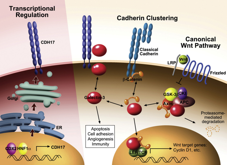 雖然CDH17在癌癥中作用的確切機制仍然難以捉摸,但幾項研究已經(jīng)揭示了它的潛在功能。在肝細胞癌(HCC)中,CDH17能與E-cadherin結合調控細胞的黏附,以及CDH17胞內銜接蛋白Galectin-3通過(guò)在細胞核中與β-catenin結合參與典型Wnt信號傳導,這表明CDH17參與Wnt信號的激活。