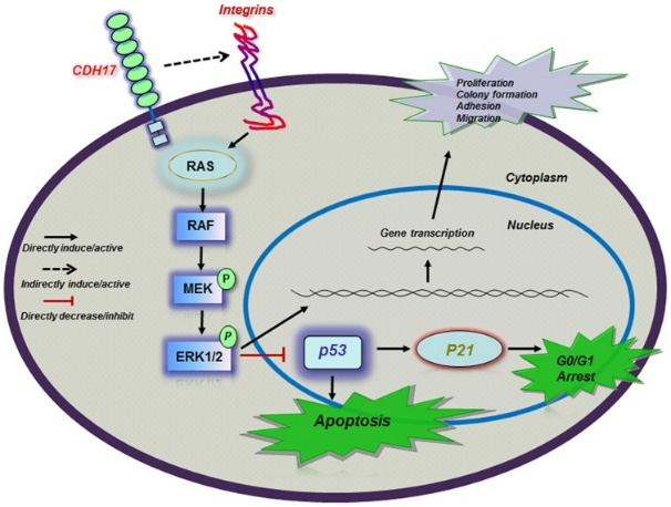 另有研究結果表明,CDH17間接影響整合素以穩定其結構和活性。在人胃癌細胞MGC-803,CDH17過(guò)表達能夠激活Ras/Raf/MEK/ERK信號通路,促進(jìn)細胞在體內的致瘤性。