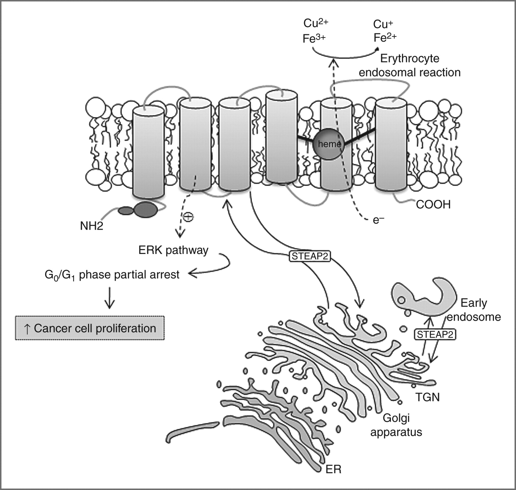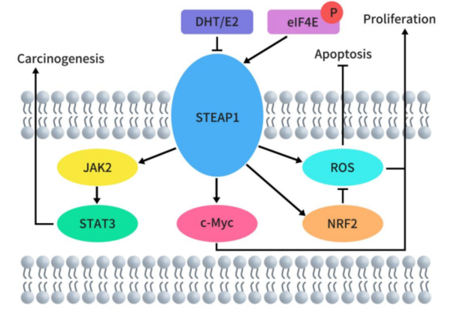 STEAP2,又被稱(chēng)為前列腺六跨膜蛋白 1(STAMP1),是一種由 490 個(gè)氨基酸組成的(56.1 kDa)蛋白質(zhì),其在高爾基體復合體、跨高爾基體網(wǎng)絡(luò )以及質(zhì)膜中高度表達。這表明 STEAP2 參與了某些內吞和外排運輸途徑。STEAP2 有助于紅細胞中 Fe3+ 和 Cu2+ 的正常攝取,并將其還原為 Fe2+ 和 Cu+,從而促進(jìn)轉鐵蛋白循環(huán)的進(jìn)行。通過(guò)激活 ERK 通路,STEAP2 誘導癌細胞在 G0-G1 細胞周期階段的部分停滯,從而增加細胞增殖和腫瘤發(fā)展。