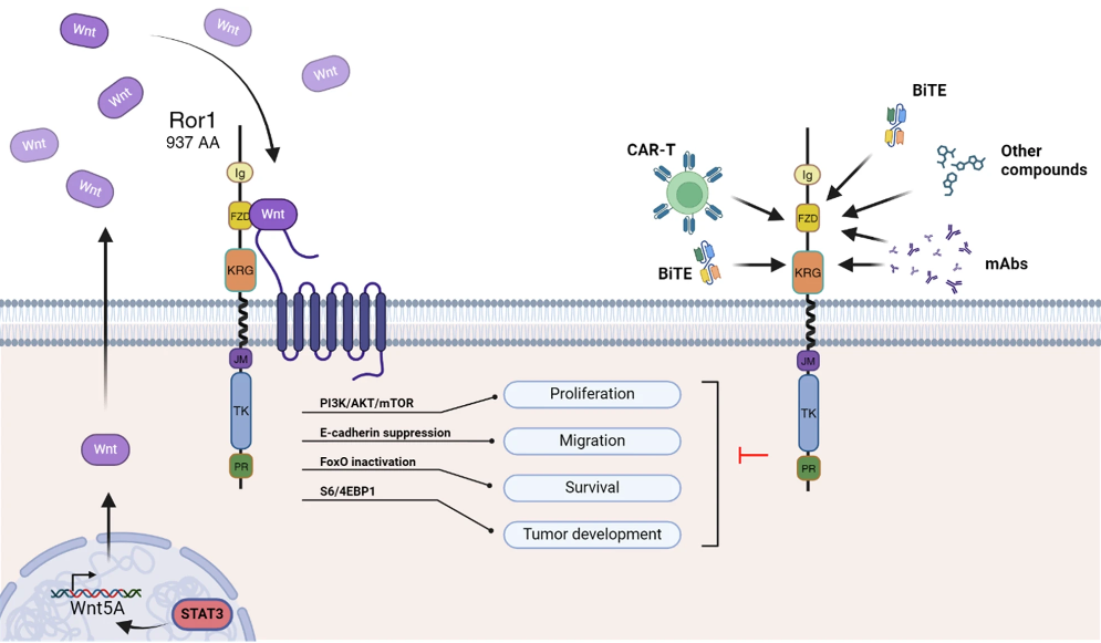 ROR1(Receptor Tyrosine Kinase-like Orphan Receptor 1)是一種I型跨膜受體酪氨酸激酶樣孤兒受體,屬于非經(jīng)典Wnt信號通路的重要受體,主要配體為Wnt5a。
