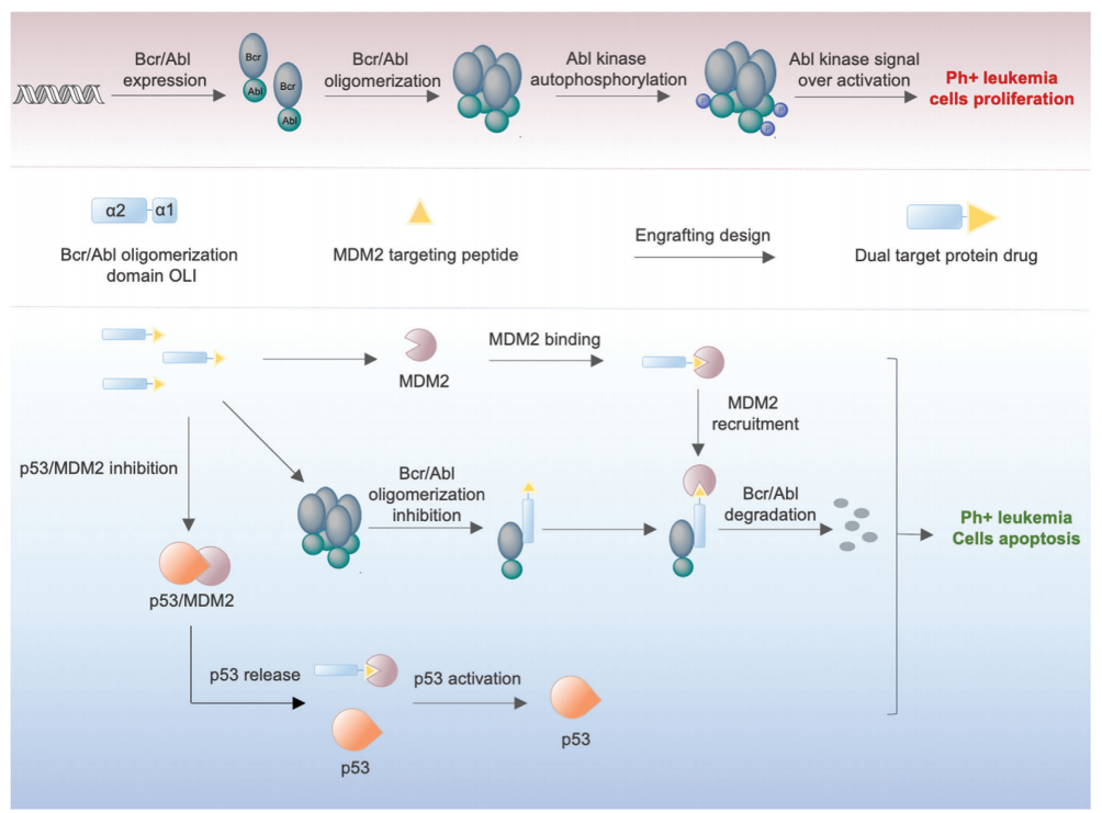 Bcr/Abl在費城染色體陽(yáng)性(Ph+)白血病中起著(zhù)核心作用,因為它構成激活Abl酪氨酸激酶及其下游通路。目前,使用酪氨酸激酶抑制劑對伊馬替尼耐藥患者的臨床治療受到耐藥性和不良反應的嚴重限制。在本研究中,通過(guò)將MDM2/p53抑制肽序列移植到Bcr/Abl四聚化結構域,設計了一種雙靶向蛋白水解靶向嵌合體(PROTAC)蛋白藥物,稱(chēng)為PMIBcr/Abl-R6。PMIBcr/Abl-R6具有Bcr/Abl靶向序列和MDM2結合序列,在Ph+白血病細胞中作為PROTAC藥物。其雙靶向結構表明,PMIBcr/Abl-R6設計靶向四聚化結構域而不是Abl激酶結構域,因此有可能克服激酶結構域的耐藥突變。PMIBcr/Abl-R6的有效能力可以同時(shí)誘導Bcr/Abl降解并激活p53通路。PMIBcr/Abl-R6具有通過(guò)多種機制克服Ph+白血病的耐藥性的潛力。