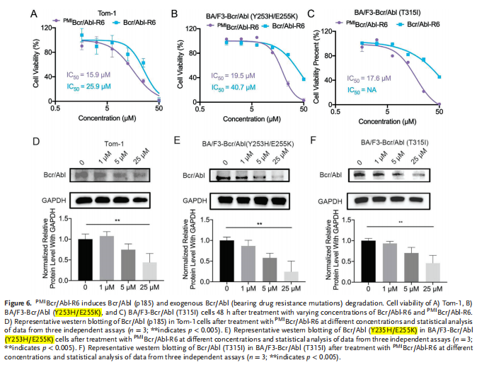科佰生物為客戶(hù)提供了BCR-ABL1 [Y253H/E255K]/BaF3(貨號CBP73326)和BCR-ABL1 [T315I]/BaF3(貨號CBP73190)產(chǎn)品,幫助客戶(hù)在細胞活性測定中對其細胞活力測定,判斷PMIBcr/Abl-R6對細胞的殺傷能力和降解能力,通過(guò)對不同濃度的PMIBcr/Abl-R6處理的細胞系代表性蛋白印跡的測定與分析,從而助力研究過(guò)程中PMIBcr/Abl-R6誘導Bcr/Abl p185和外源性表達的Bcr/Abl攜帶耐藥性突變。