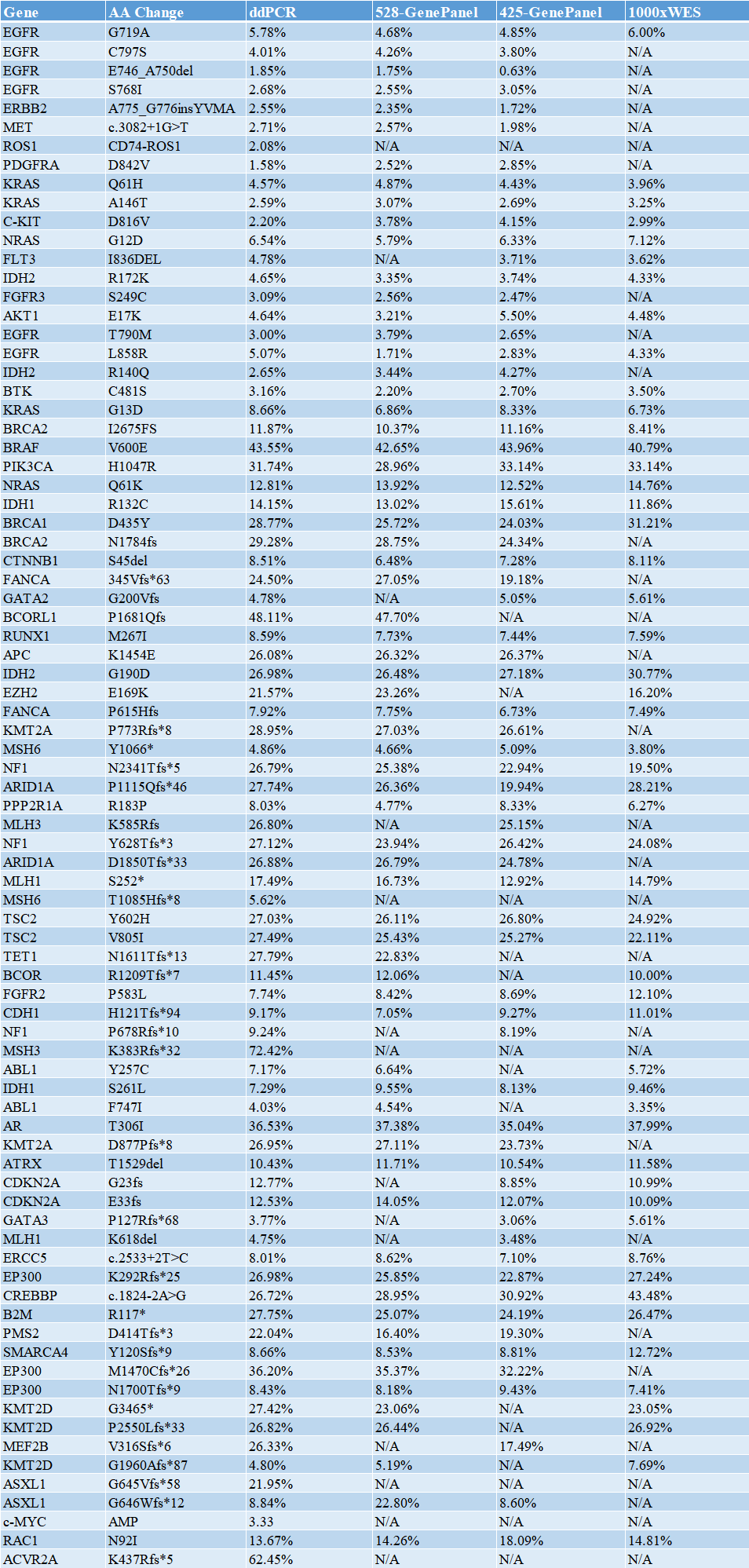 3.定標方案更科學(xué):采取4種方法定標,分別是1000xWES,3000x 425 Gene-Panel(友商-組織樣本),3000x 528 Gene-Panel(內部開(kāi)發(fā)探針捕獲法),82位點(diǎn)的ddPCR(3復孔);