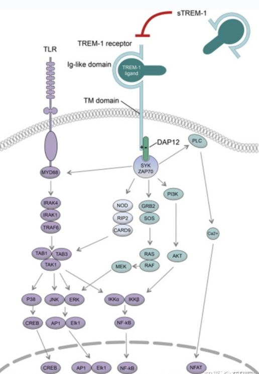 在TREM1被激活后,與其相關(guān)的DAP12蛋白含有ITAMs的胞質(zhì)部分在其酪氨酸殘基上磷酸化,然后與ZAP70和SYK蛋白結合,使其磷酸化。SYK促進(jìn)包含Cbl、SOS和GRB2的適應性復合物的招募和酪氨酸磷酸化,從而通過(guò)PI3K、PLC-Gamma和ERK途徑導致下游信號轉導。這些途徑誘導Ca2 +動(dòng)員,重新排列肌動(dòng)蛋白細胞骨架和激活轉錄因子,如Elk1、NFA、AP1、c-Fos、c-Jun和Nf-κB,這些轉錄因子編碼促炎癥細胞因子、趨化因子和細胞表面分子。此外,TREM1誘導的PI3K和ERK途徑的激活可以通過(guò)滅活促凋亡因子來(lái)促進(jìn)線(xiàn)粒體的完整性和細胞生存:BID、BAD和BAX,并抑制CytoC從線(xiàn)粒體釋放。