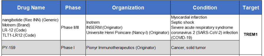 TREM1作為一個(gè)新靶點(diǎn),全球范圍內披露的研發(fā)管線(xiàn)不多,針對TREM1靶點(diǎn)有2款產(chǎn)品進(jìn)入臨床,1款產(chǎn)品即將進(jìn)入臨床(Celsius公司的CEL383,適應癥為炎癥性腸?。?。適應癥主要為急性感染性疾病、自身免疫性疾病和癌癥。目前TREM1靶點(diǎn)針對癌癥的臨床前藥物比較活躍的是nangibotide(處于臨床II/III期)及PY-159(處于臨床I期)。其中較引人關(guān)注的是Pionyr Immunotherapeutics公司的TREM1抗體PY159正在與帕博利珠單抗聯(lián)合用于晚期實(shí)體瘤患者的Ia/Ib期研究。PY159 是一種人源化單克隆抗體,能特異性地結合表達在髓系細胞上的TREM1,并通過(guò)交聯(lián)TREM1/DAP12 復合物誘導下游信號傳導,發(fā)揮激動(dòng)劑的作用。2023年 ASCO報道的 PY159 的用于冷腫瘤相關(guān)瘤種的I期的臨床研究,結果顯示總體安全性可控,療效方面 ORR 為 6%,DCR 為 33%,其中胰腺癌患者展現出較好的療效??偟膩?lái)說(shuō),TREM1靶點(diǎn)藥物的作用機理和效果還不是非常明確,正在研發(fā)的藥物療效也不是很出色,未來(lái)前景還值得繼續觀(guān)察。