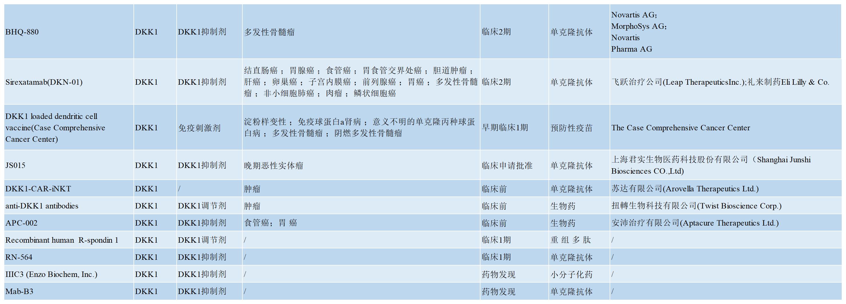DKK1具有調節免疫的特性,它對免疫系統的抑制作用使其成為免疫治療的一個(gè)有前景的靶點(diǎn)。此前,Leap Therapeutics開(kāi)發(fā)了抗DKK1中和抗體DKN-01并在晚期胃食管交界處和胃癌癥(GEJ/GC)以及婦科癌癥的I期或II期試驗中進(jìn)行了評估,其方案包括與紫杉醇或pembrolizumab的單藥治療和聯(lián)合治療比較,值得注意的是,患有Wnt信號突變的婦科癌癥患者可以從DKN-01治療中獲益。GEJ/GC的另一項正在進(jìn)行的臨床研究也表明,在腫瘤表達高水平DKK1(DKK1高)的患者中生存率和客觀(guān)反應結果都有所提高;非常令人鼓舞的結果表明,DKN-01加Keytruda治療可使中位無(wú)進(jìn)展生存期(PFS)超過(guò)22周,中位總生存期(OS)接近32周,在既往未接受抗PD-1/PD-L1治療的DKK1高GEJ/GC患者中,ORR為50%,疾病控制率(DCR)為80%;在對PD-1/PD-L1治療難治的6名GEJ/GC患者中,3名血清DKK1水平高的患者病情穩定,而3名血清DKK1水平低的患者病情則發(fā)生進(jìn)展。這些結果表明,DKK1抑制治療顯著(zhù)改善了血清DKK1水平高的患者的療效,并由此得出在DKK1高表達腫瘤患者中使用DKK1抑制劑和PD1/PDL-1免疫檢查點(diǎn)聯(lián)合治療的方案是一種獲得更好療效的策略。目前已有多個(gè)DKK1抑制劑處于研發(fā)階段,其中多數為DKK1的中和抗體,也有少量的小分子及重組多肽,小核酸藥物等( 如下表所示)。