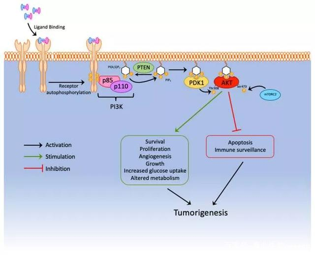 圖1. PTEN抑制PI3K途徑和AKT的下游致癌信號。通過(guò)使PIP3磷酸化,PTEN阻止了PDK1激活AKT,從而防止了腫瘤的發(fā)生。