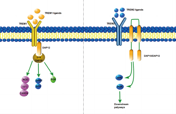 TREM(Triggering receptor expressed on myeloid cells)家族屬于細胞表面受體,介導調控炎癥反應。TREM1屬于髓系細胞表面受體,在多種腫瘤微環(huán)境中均表達,協(xié)同經(jīng)典的模式識別受體(PRR),例如Toll-like受體(TLR)家族和Nod-like受體(NLR)家族,在宿主防御中放大由微生物成分介導的炎癥反應,具有抗腫瘤的作用。TREM2(Triggering receptor expressed on myeloid cells-2)是免疫球蛋白超家族的跨膜受體,僅在中樞神經(jīng)系統(CNS)的小膠質(zhì)細胞等骨髓細胞中表達。TREM2有多種配體,主要有APOE, HDL, LDL以及Aβ等。TREM2通過(guò)其與接頭蛋白DAP12和DAP10的關(guān)聯(lián)發(fā)出信號。DAP12是參與先天免疫應答的細胞中表達的信號傳導銜接蛋白,介導脾酪氨酸激酶SYK的激活,DAP12促進(jìn)質(zhì)膜上TREM2的穩定,可以調控細胞的增殖,生存以及炎癥等信號通路。TREM2還可以結合DAP10,而DAP10通過(guò)招募磷脂酰肌醇3-激酶(PI3K)促進(jìn)信號傳導。