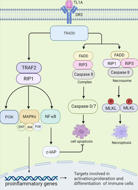 在靜息的T細胞中,DR3以可溶性形式表達,保護細胞免于凋亡?;罨腡細胞表達跨膜DR3。sTL1A結合DR3 (膜結合形式)激活下游信號級聯(lián),從而調節免疫反應和炎癥。sTL1A/DR3相互作用可觸發(fā)兩種不同的信號通路,分別引起炎癥和細胞凋亡。首先,DR3的死亡結構域與細胞質(zhì)中的適配蛋白TNFR相關(guān)死亡結構域蛋白(TRADD)結合,然后招募TNFR相關(guān)因子2 (TRAF2)和受體相互作用蛋白1 (RIP1)。這些復合物激活MAPKs (ERK、p38和JNK)、NF-κB和效應激酶PI3K信號傳導。最后,激活的信號傳導調節促炎基因的表達,參與免疫相關(guān)疾病的發(fā)生。TRADD結合FAS相關(guān)死亡結構域(FADD)和RIP3,激活半胱氨酸天冬氨酸特異性蛋白酶-8 (caspase-8)形成復合物,進(jìn)一步激活下游caspase通路(如caspase-3和-7),誘導凋亡細胞死亡。當caspase-8活性被阻斷時(shí),FADD、RIP3、RIP1與下游效應分子混合譜系激酶結構域樣蛋白(mixed lineage kinase domain-like protein, MLKL)在磷酸化后形成胞質(zhì)“壞死體”復合體。然后,MLKL寡聚到細胞膜上,導致壞死性細胞死亡,這是一種伴有強烈炎癥的細胞死亡形式。在這個(gè)過(guò)程中,NF-κB被證明可以誘導細胞凋亡抑制蛋白(c-IAP)的激活,從而介導細胞凋亡的負反饋調節和抑制。事實(shí)上,更多的證據表明,sTL1A與DR3的連接優(yōu)先誘導淋巴細胞的促炎途徑而不是凋亡。
