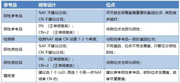 2.陽(yáng)性參考品設置最為復雜,著(zhù)重聚焦臨床意義的基因位點(diǎn),不要求全覆蓋,同時(shí)要考慮靈敏度(最低檢出限LoD)設置,考慮到濃度梯度或突變梯度的不同,應對各水平陽(yáng)性參考品設置相應檢出要求;