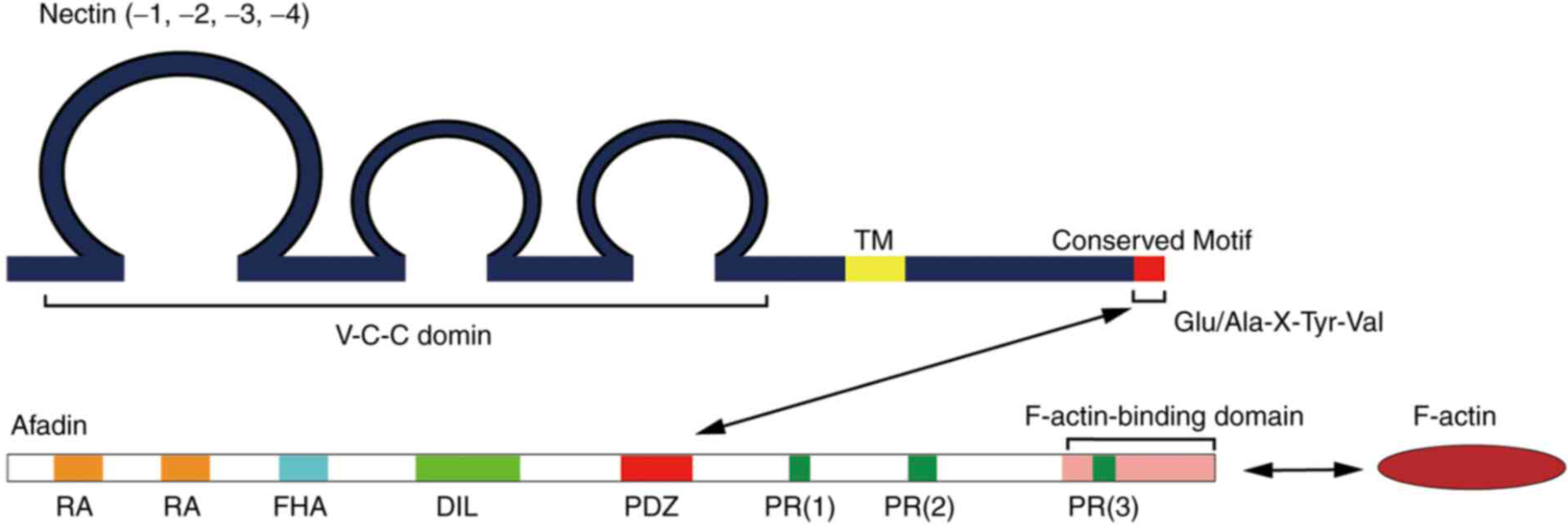 胞質(zhì)尾的C端都包含一個(gè)afadin (一種 F-肌動(dòng)蛋白結合蛋白)結合基序,與Nectin-4不同的是,Nectin-1、Nectin-2、Nectin-3的afadin結合基序都是保守序列 Glu/Ala-X-Tyr-Val,可與 afadin的PDZ 結構域結合;而Nectin-4可通過(guò)其C末端的 Gly-His-Leu-Val 基序與銜接分子afadin結合。當Nectins與銜接分子afadin結合后,afadin會(huì )結合并募集絲狀肌動(dòng)蛋白組件 (F-actin),從而促進(jìn)細胞與細胞之間的粘附。Nectin家族與鈣黏著(zhù)蛋白共同作用,對粘著(zhù)連接和緊密連接的產(chǎn)生和維持具有顯著(zhù)影響,它們調節多種細胞行為,包括細胞粘附、生長(cháng)、分化、遷移和凋亡。