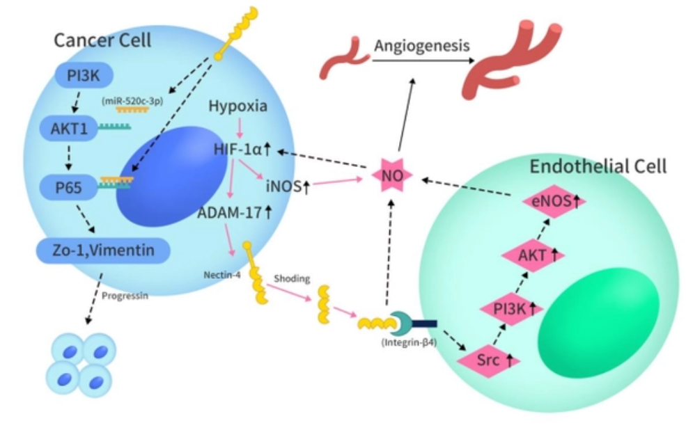 Nectin-4在正常的胚胎和胎兒組織中含量很高,但成年人的正常組織中通常表達較低,且在各種癌細胞上表達較高,比如宮頸癌、尿路上皮癌、乳腺癌、肺癌、胃癌、頭頸癌、胰腺癌等,主要通過(guò)激活PI3K/Akt途徑促進(jìn)腫瘤細胞增殖、分化、遷移、侵襲等。