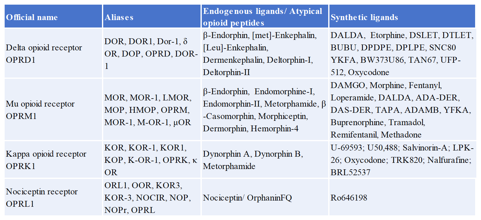 阿片受體(OPR) 屬于A(yíng)類(lèi)g蛋白偶聯(lián)受體,可被嗎啡等生物堿類(lèi)阿片和內源性配體如內啡肽、腦啡肽等激活。OPR及其配體可見(jiàn)下表。