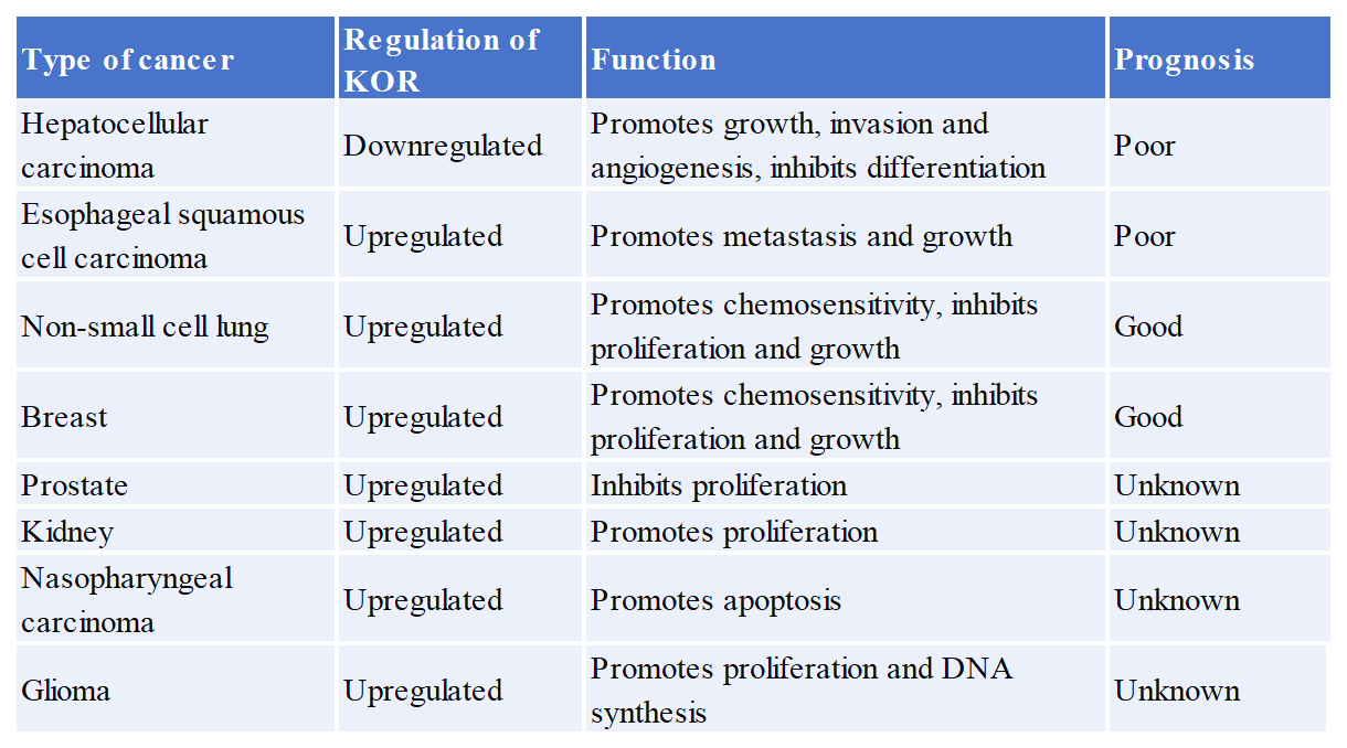 阿片類(lèi)藥物是最有效的鎮痛藥,已廣泛用作治療疼痛和相關(guān)疾病的治療藥物。除了疼痛,阿片類(lèi)藥物還經(jīng)常用于治療許多其他疾病包括腹瀉、咳嗽、術(shù)后疼痛和癌癥。有報道指出KOR可能與幾種癌癥的預后有關(guān),如下圖所示:
