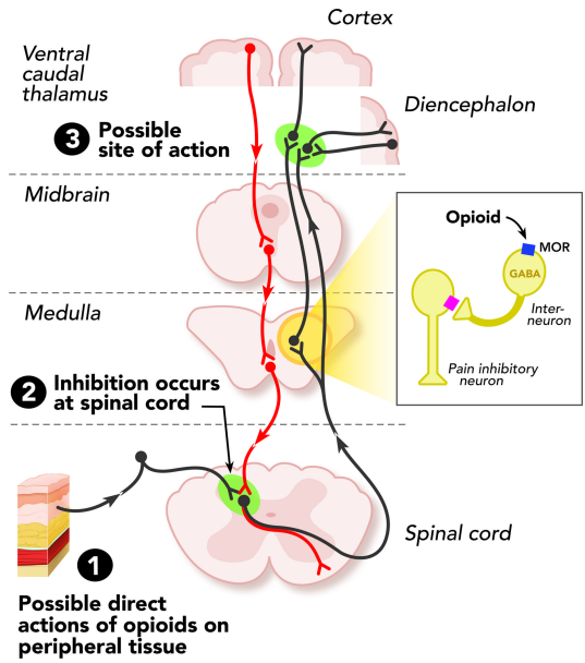 阿片受體在疼痛調節下行通路中表達,其中包括髓質(zhì)藍斑和導水管周?chē)疑珔^。它們也在大腦邊緣,中腦和皮質(zhì)結構。