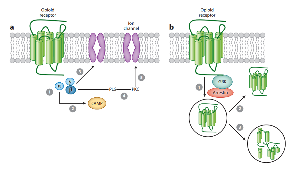 早期阿片受體藥理學(xué)研究表明,鳥(niǎo)嘌呤三磷酸鳥(niǎo)苷(GTP)等核苷酸調節激動(dòng)劑與腦組織膜制劑中的阿片受體結合。后來(lái)確定GTPase活性由阿片激動(dòng)劑和內源性阿片肽調節。激動(dòng)劑刺激阿片受體抑制環(huán)腺苷一磷酸(AMP)的產(chǎn)生方式與其他類(lèi)型的g蛋白偶聯(lián)受體(GPCR)相似。阿片受體對cAMP信號的抑制通路屬于Gαi依賴(lài),即阿片受體和激動(dòng)劑結合時(shí)會(huì )抑制cAMP的形成。四個(gè)阿片受體具有相似的信號通路,每個(gè)阿片受體上的選擇性配體結合阿片受體后可引起cAMP形成抑制,MAPK信號通路激活,或者Arrestin招募,蛋白內化等。