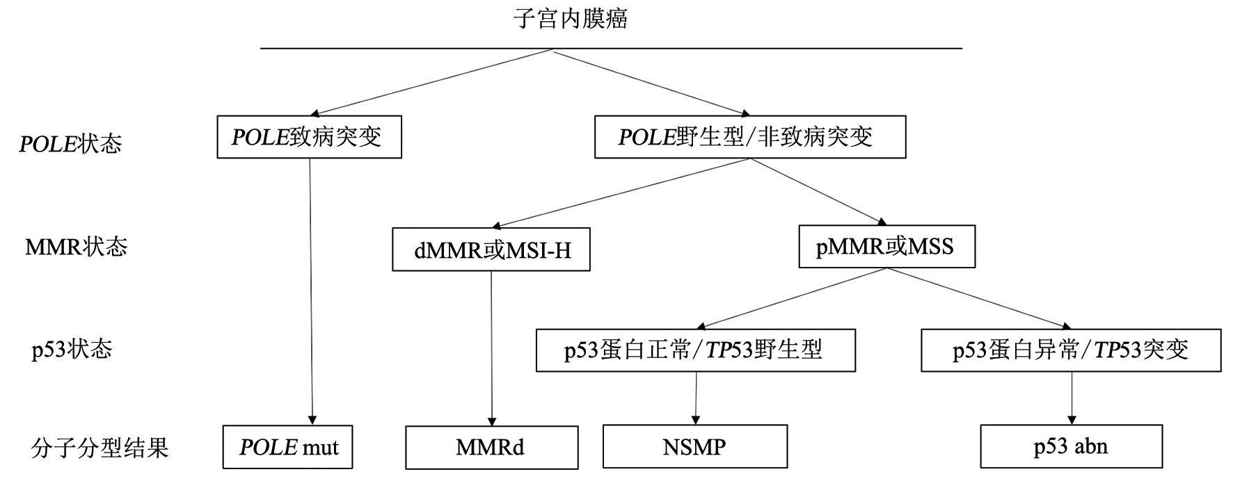 2013年美國癌癥基因組圖譜(TCGA),依據子宮內膜癌全基因組、轉錄組、蛋白組等多組學(xué)檢測結果,將其分為POLE突變型、微衛星不穩定突變型、低拷貝數型和高拷貝數型等4種類(lèi)型。2023年國際婦產(chǎn)科聯(lián)盟(International Federation of Gynecology and Obstetrics,FIGO)分期建議,所有的子宮內膜癌EC患者均應完善分子分型檢測。